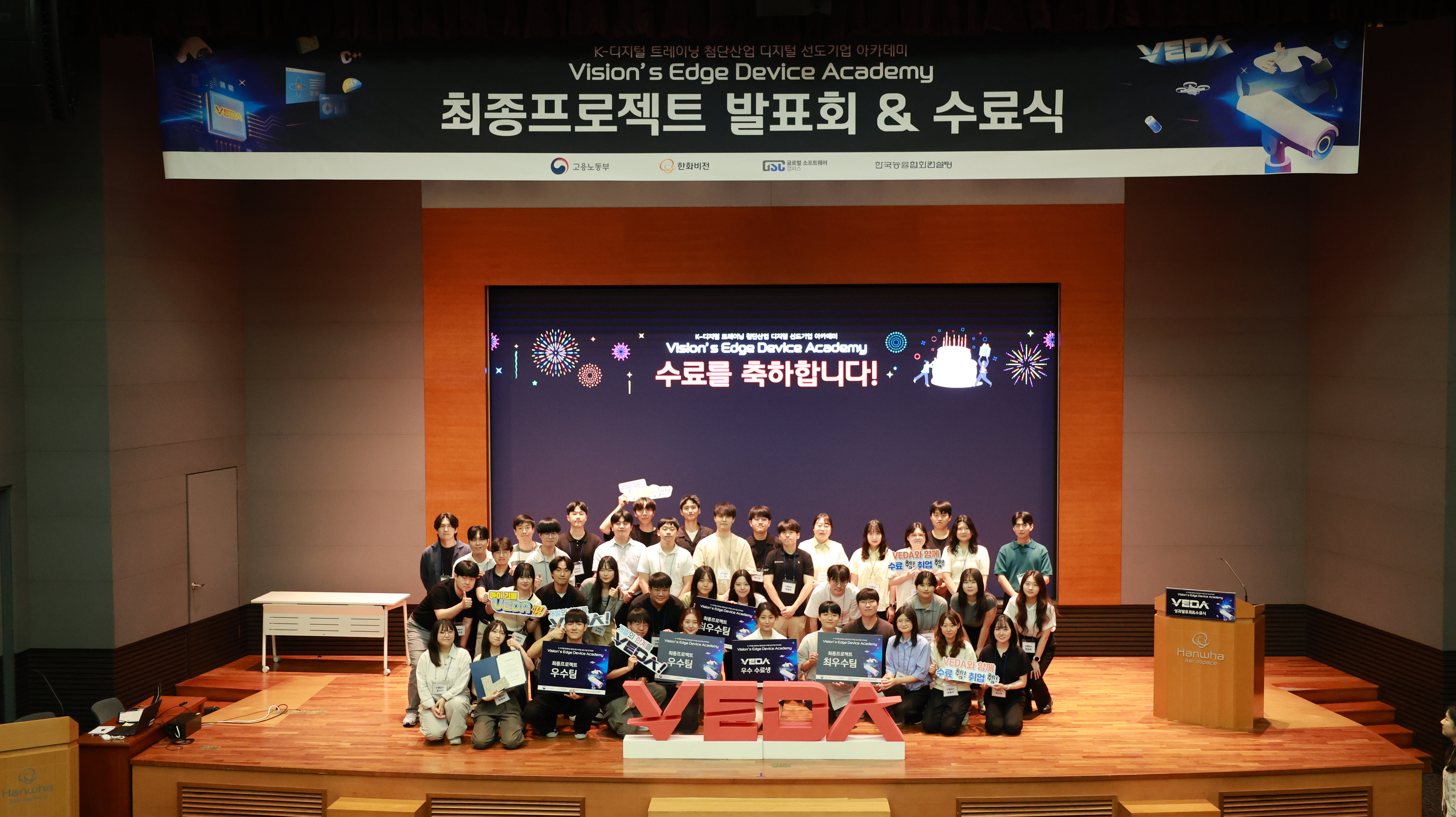 글로벌소프트웨어캠퍼스가 한화비전과 함께 운영한 ‘Vision’s Edge Device Academy(베다)’ 최종 프로젝트 발표회 및 수료식에서 참가자들이 기념 촬영을 하고 있다.