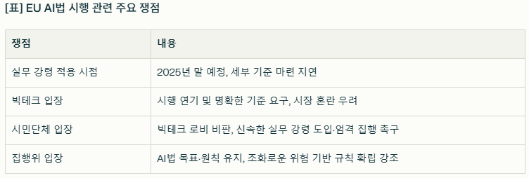 한편, 시민단체 ‘Corporate Europe Observatory’는 “빅테크 기업들이 실무 강령 지연을 빌미로 규제 완화를 노리고 있다”며, 이들의 로비 활동을 강하게 비판했다. 이 단체는 “AI법이 실효성을 갖추려면, 실무 강령의 신속한 도입과 엄격한 집행이 필수”라고 주장했다.