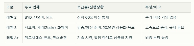 글로벌 경쟁과 중국의 전략 - 기술·비용 우위 중국 업체들은 칩, 센서 등 하드웨어 원가를 대폭 낮추고, 대중차에도 첨단 기능을 무료 또는 저가로 제공한다. BYD, 포드 등은 ‘갓스 아이’ 등 ADAS 소프트웨어를 전 차종에 기본 탑재했다. - 정부의 산업 주도 베이징은 9개 기업에 자율주행 공개 시험을 허용하고, 레벨 3 사고 발생 시 제조사·부품사 책임을 명확히 하는 규제도 준비 중이다. - 글로벌 비교 미국은 규제 미비로 업계 불만이 크고, 유럽(영국 등)은 책임 소재를 강화하는 법률을 도입했다. 중국은 ‘돌을 더듬으며 강을 건넌다’는 점진적 규 제와 실증 정책으로 시장 확대와 안전을 동시에 꾀한다.