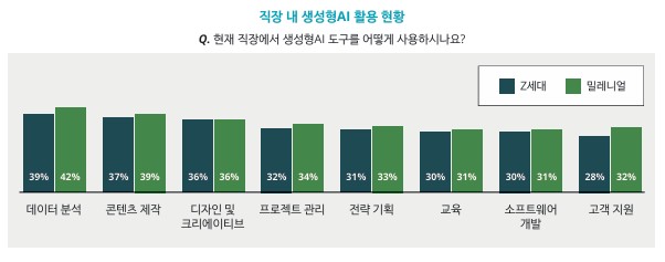 국내 Z세대 63%, 밀레니얼 53%가 생성형 AI를 업무에 활용하고 있으며, 한국 Z세대는 ‘콘텐츠 제작’(38%), 한국 밀레니얼은 ‘데이터 분석’(50%)에 AI를 적극 활용하는 것으로 나타났다. 이는 글로벌 평균을 상회하는 수치다.